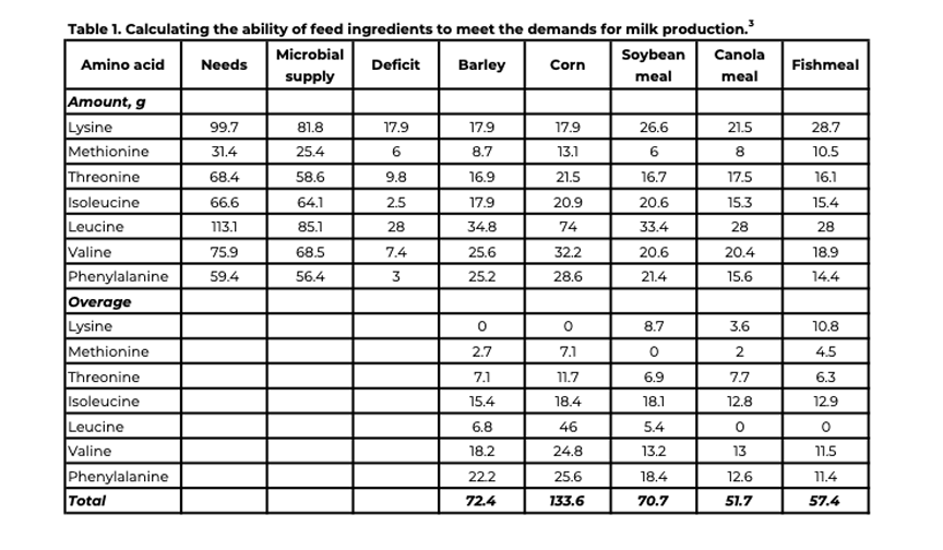 The researchers presented an example where they calculated amino acid needs for a cow producing 66 pounds of milk and evaluated how well different feed ingredients – barley, corn, soybean meal, canola meal and fishmeal – filled the gap left after microbial contribution (Table 1).